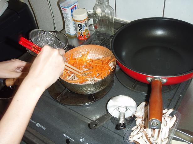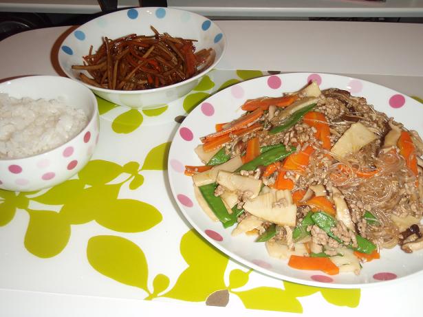 ■ メイン以外にもきんぴらも作る予定。 ■ ふむふむ。 ■ やはり具材はキッチリ。料理番組のようである。 ■ ば~ん!完成。 メインは「ひき肉とはるさめのいためもの」。 それと「きんぴらごぼう」である。どちらも白飯が進む! はるさめのほうは片栗粉を入れすぎたと反省していたみきちゃん。みき反省。 また1つ成長したな(何様 そろそろカレーを作ってもらおうか